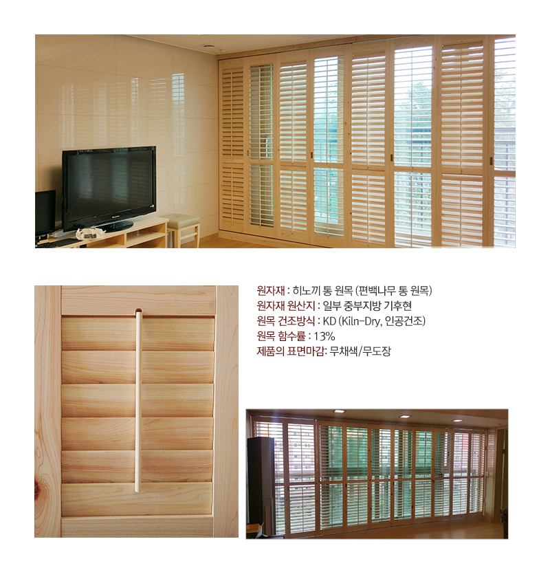 루버셔터 히노끼 제품은 그 어떠한 페인트나 집성(유해한 본드성분이 있는)가공을 하지 않은 순수한 원.목.나.무 를